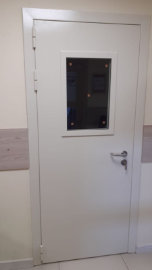 Металлическая дверь со стеклом закрывает выход из подсобного помещения в коридор. Класс огнестойкости EI 60. В створке установлен прозрачный жаростойкий стеклопакет.