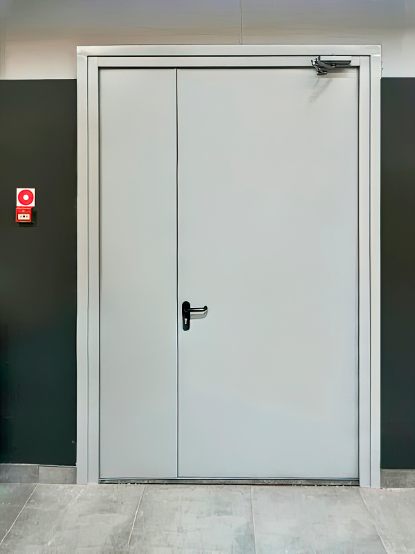 Двери имеют предел огнестойкости EI 60 (сохранение герметичности проема при пожаре – 1 час). В одной из створок установлен огнеупорный стеклопакет, соответствующий классу конструкции. Материал изготовления: сталь с порошковым покрытием. В комплектацию входят негорючая теплоизоляция, специальные уплотнители, доводчики и огнестойкие замки. На уличной двери установлена ручка «Антипаника».